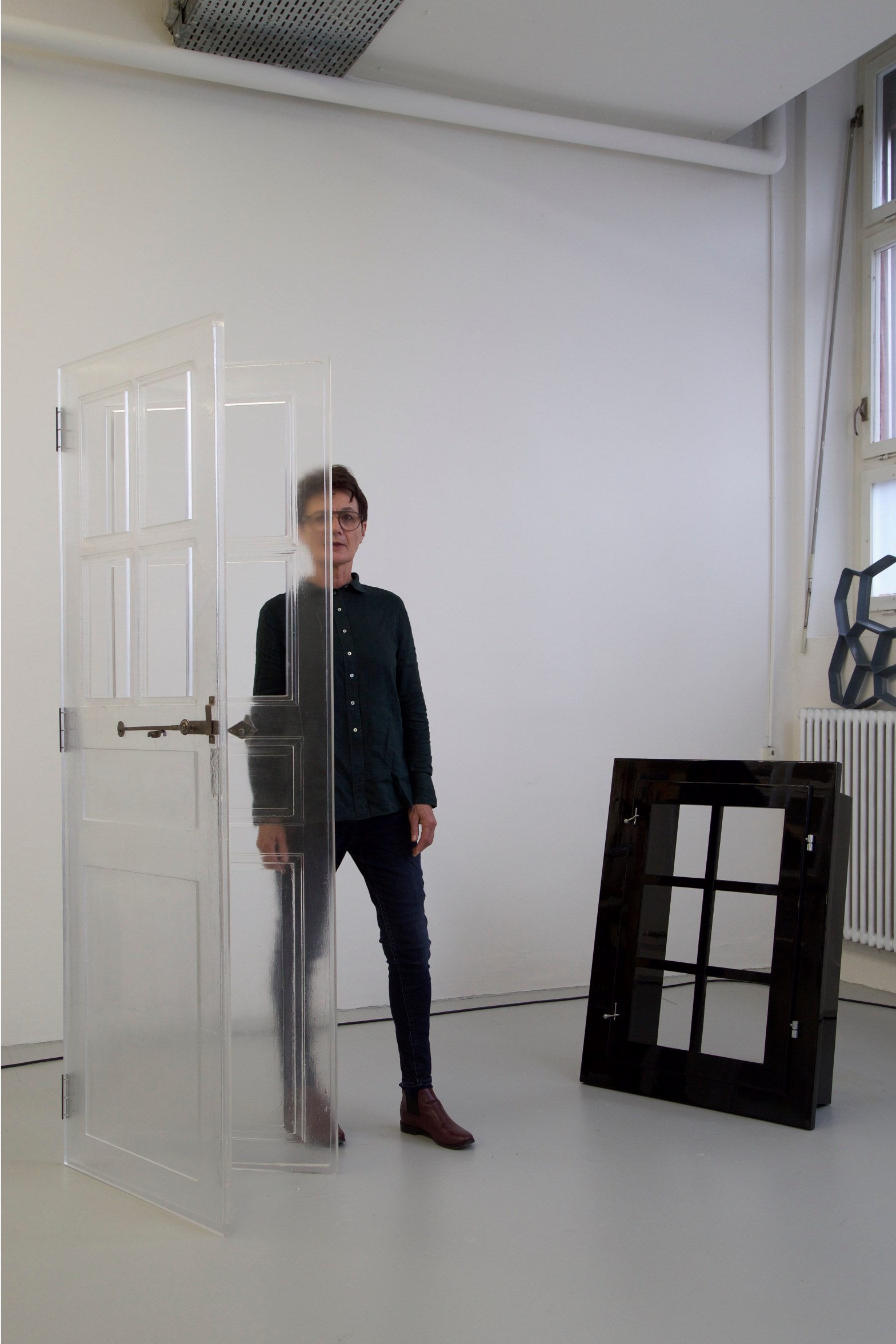 “Password” 2015 – painted wooden door, all panes, opening devices and hinges removed. Transparent cast of both sides of the door. Original opening devices and hinges mounted.
