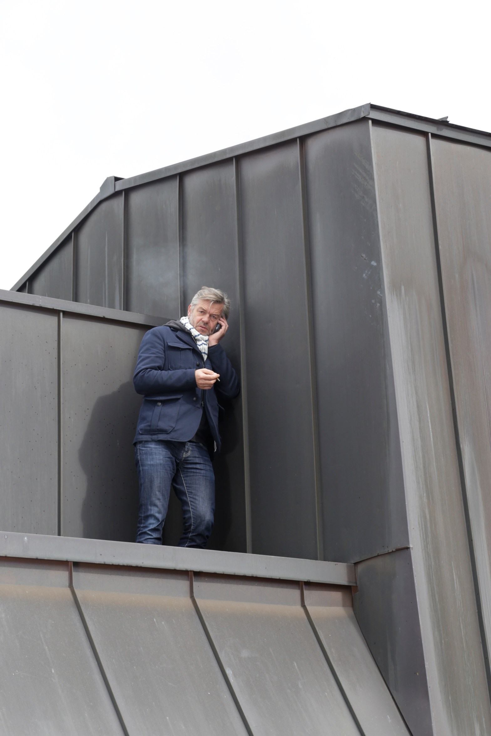 Kupferkater oder leitender Tiger – es ist für ihn nur ein Sprung aufs matt verwitterte Blech, er lebt in der Dachwohnung und auf der grossen Terrasse nebenan. In der einen Hand das Telefonino, in der anderen die bengalische Glut. Frisch poliert würde dieses Dachkupfer glänzen, anspielungsreich, nun zeigt es fröhliche Patina. Und ist Kulisse für einen frühen Windsurfmeister und Wellenreiter, der in Bussen jahrelang unterwegs gewesen war an ferne Küsten oder Striche. Bewegte Linien, er ist ein Zeichner, agiert heute mit poetischem Charme, oft in maximaler Wellenferne, im frankenlastigen öffentlichen Raum. Halstuch schützt Herz.
