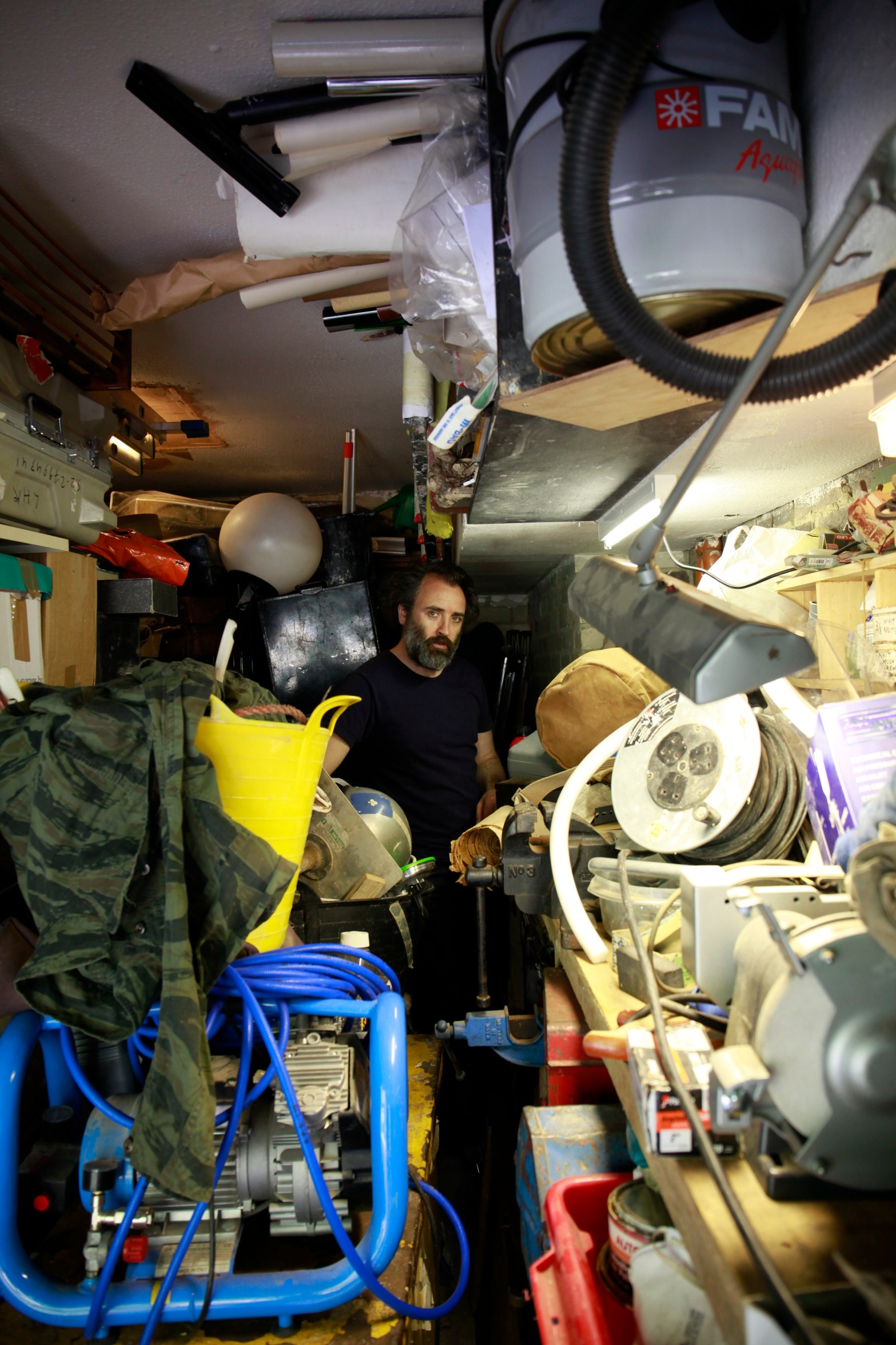 All sculptural questions apply, and probably do each time. Surrounded by raw, found, lost and reclaimed material, Mike Nelson has to consider, each time, whether to err in favour of making an independent sculpture, to wholly submit to a particular place, or whether to give in to expectation and produce a whole new construction of three-dimensional fiction. He uses his studio to ponder and plot, and the photograph reveals just one moment in a perpetual round of questioning.