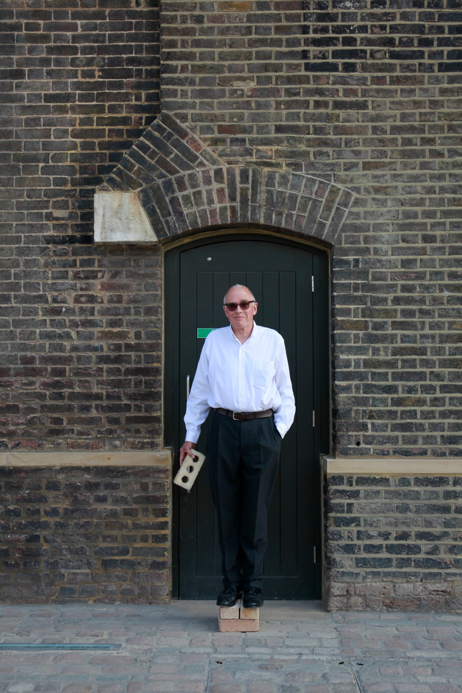 In this photograph, the relation of figure to architecture has something of Vitruvian Man about it. There is play-heroism about the fact that he is standing on a plinth, which, as if it were a preliminary sketch by Carl Andre, is made of a few assembled bricks. This is consistent with his version of nobility: he wants to extend honour and sympathy to people who make things, even as he makes visible their absurdities and eccentricities. He is sceptical of established hierarchies of value. He is, himself, modest.