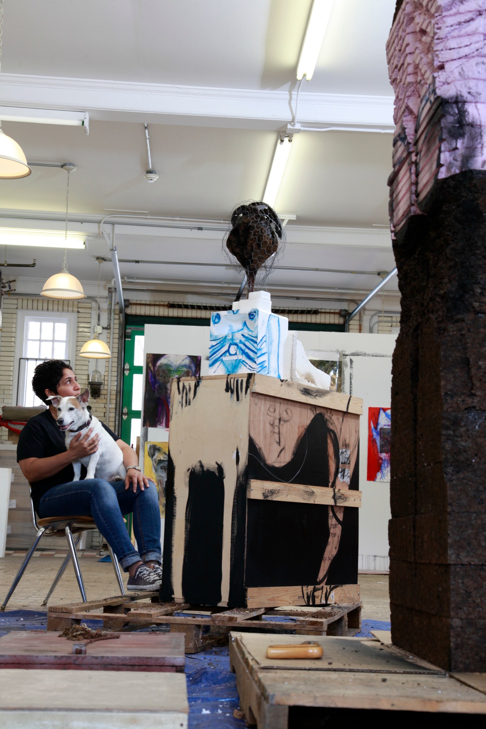 HRHD2014Poughkeepsie, 2014 The artist’s dog gazes to the left of the camera. As with most animals, it is clearly in the moment, ears perked, fully attuned to its present circumstances. The artist, holding the dog on her lap, is looking upwards towards the top of a work in progress, and although we can’t say forContinue reading “Huma Bhabha”